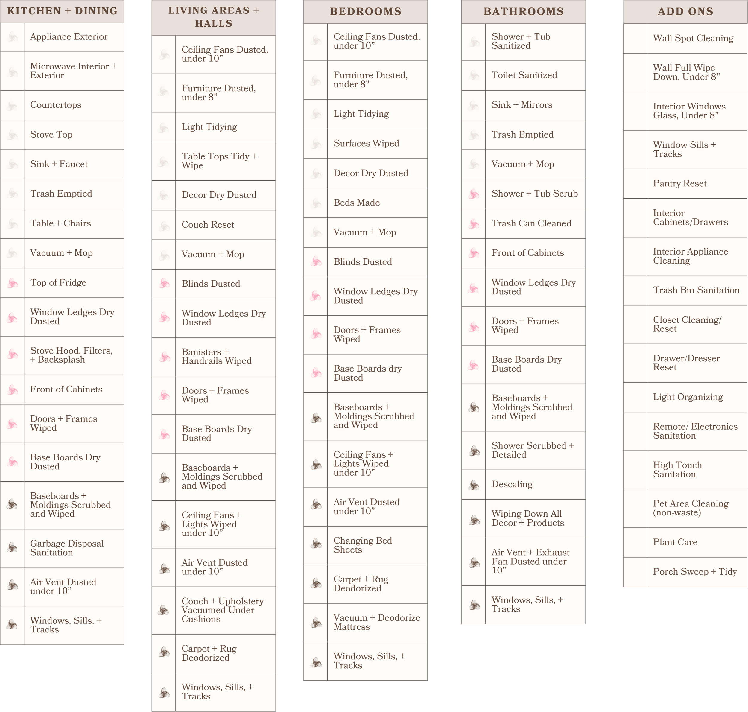 The color coded icons make it easy to see which tasks are included in each cleaning package — Basic, Reset, or Deep.